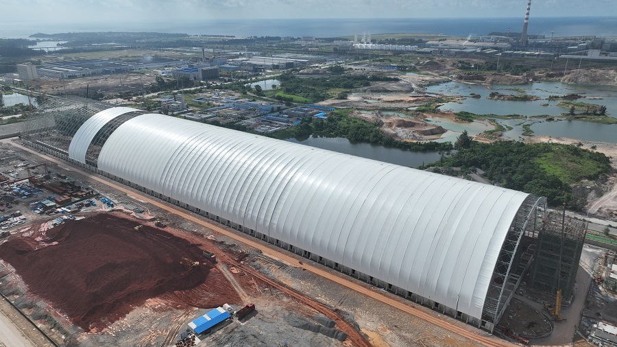 該項目位于廣西壯族自治區防城港市港口區企沙鎮,其中礦石堆棚總建筑面積約6.5萬平方米,長度558米,跨度114米,建筑高度約48.3米,主體結構采用網架鋼結構與膜結構相結合的形式,屋面設計為進口PE膜結構。施工期間,項目團隊立足現場施工實際,確定了“地面拼裝、三段吊裝、高空合龍”的施工方案。自6月5日首榀鋼結構吊裝至最后一榀網架就位,礦石堆棚主體鋼結構施工僅用時90天,建設速度達到同行業同類型項目的領先水平。